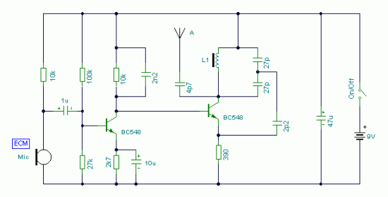 I have used a pair of BC548 transistors in this circuit. Although not strictly RF transistors, they still give good results. I have used an ECM Mic insert from Maplin Electronics, order code FS43W. It is a two terminal ECM, but ordinary dynamic mic inserts can also be used, simply omit the front 10k resistor. The coil L1 was again from Maplin, part no. UF68Y and consists of 7 turns on a quarter inch plastic former with a tuning slug. The tuning slug is adjusted to tune the transmitter. Actual range on my prototype tuned from 70MHz to around 120MHz. The aerial is a few inches of wire. Lengths of wire greater than 2 feet may damp oscillations and not allow the circuit to work. Although RF circuits are best constructed on a PCB, you can get away with veroboard, keep all leads short, and break tracks at appropriate points.
