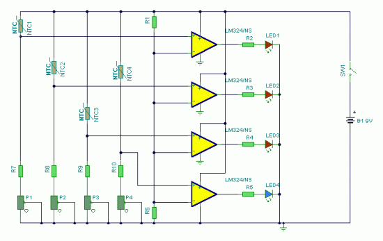 NTC1-4 The thermistors maximum resistance must roughly equal the resistance of the fixed resistor and preset. As negative temparature coefficient (NTC) thermistors are used, then their resistance decreases for increases in temperature. I used a thermistor from the Maplin Catalogue. Cold resistance was around 300K, hot resistance 15k. Alternative thermistors may be used with different resistance ranges, but the presets P1 to P4 must also be changed as well.