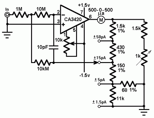 This circuit uses a CA3420 BiMOS op amp to form a picoammeter with 4 ranges. The exceptionally low input current (typically 0.2pA) makes the CA3420 highly suited for use in a picoammeter circuit. Input transient protection is provided by the 1 megohm resistor in series with the input. The 10 megohm resistor connected to pin 2 decouples the potentially high input capacitance often associated with lower current circuits and reduces the tendency for the circuit to oscillate under these conditions. The 10k potentiometer is used for null offset.