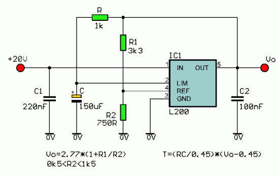In order to perform this soft-start function, the LM317 voltage regulator IC requires an external universal PNP transistor and the L200 uses its internal comparator (pin 2).
